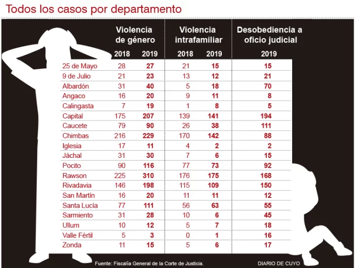 El informe también contabilizó las causas de violencia intrafamiliar, entre las que se encuentran agresiones físicas, psicológicas, sexuales o económicas, que se dan entre padres e hijos y viceversa y entre el matrimonio o pareja. En ese caso, los departamentos más afectados, en proporción a su población, fueron Chimbas, Rawson y Ullum. En el otro extremo está Valle Fértil, municipio en el que hubo una sola denuncia. Ante estas situaciones, los jueces de cualquier fuero pueden tomar diferentes medidas de protección como excluir al agresor de la vivienda, prohibirle la comunicación con la víctima, limitarle el acceso a los lugares que esta frecuenta y decretar la tenencia adecuada de los menores, entre otras.