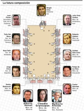 Completan el equipo: Roberto Gattoni (ministro de Hacienda), Julio Ortiz Andino (ministro de Infraestructura), Emilio Baistrocchi (ministro de Gobierno), Felipe de los Ríos (ministro de Educación), Castor Sánchez (ministro de Salud), Andrés Díaz Cano (ministro de Producción) y Juan Flores (secretario General de la Gobernación). Jorge Chica también y encabezará Deportes, el área que Uñac quiere convertir en Secretaría de Estado.