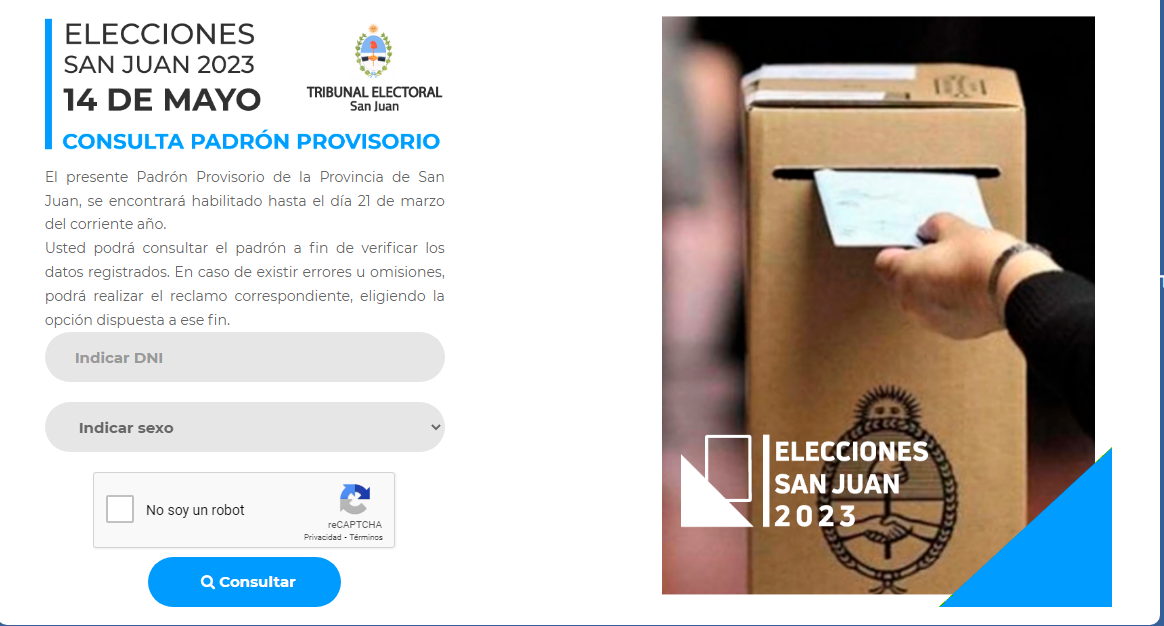 Desde este martes 14 de marzo están disponibles, de modo online, los datos provisorios del padrón para las elecciones provinciales del próximo 14 de mayo. El objetivo es que cada sanjuanino ingrese y corroboro que sus datos sean los correctos. De no ser así, se podrá reclamar correcciones hasta el 21 de marzo.
