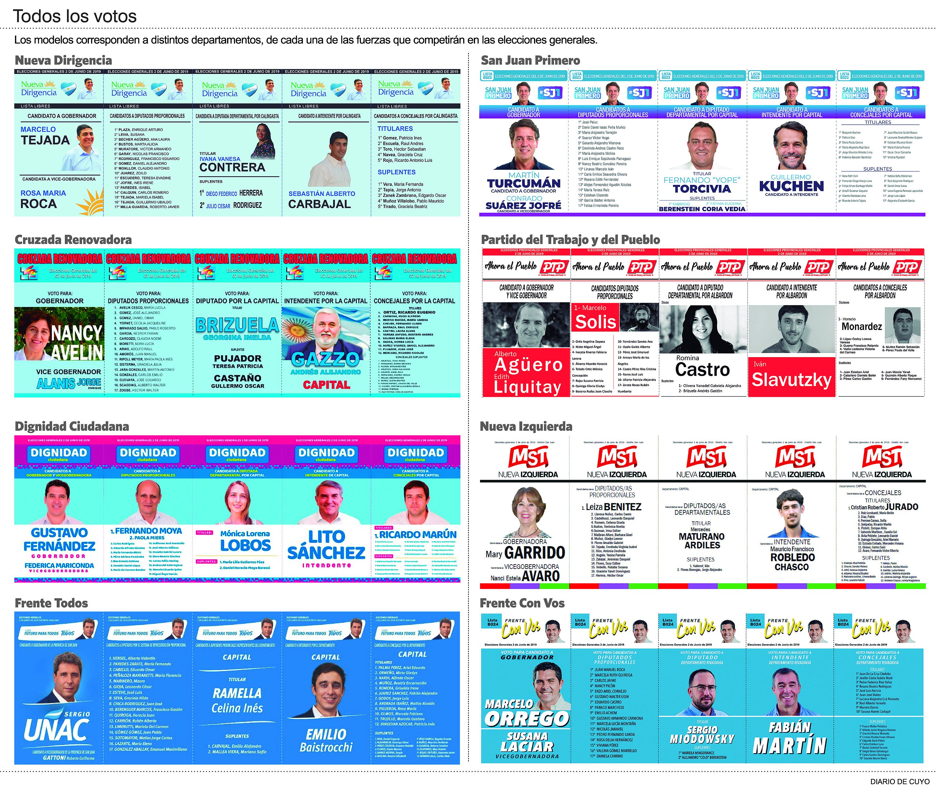 El resto de los espacios, Nueva Dirigencia, de Marcelo Tejada; el Partido del Trabajo y el Pueblo, de Alberto Agüero, y los frentes Con Vos, de Marcelo Orrego, y Todos, que comanda Sergio Uñac, mantiene el mismo diseño y color de las primarias.