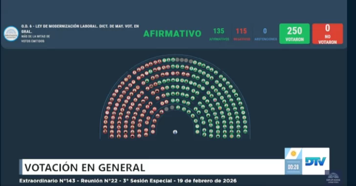Tras la maratónica sesión que se extendió por más de 12 horas, la Cámara de Diputados aprobó la Ley de Modernización Laboral enviada por el Poder Ejecutivo por 135 votos a favor y 115 en contra.