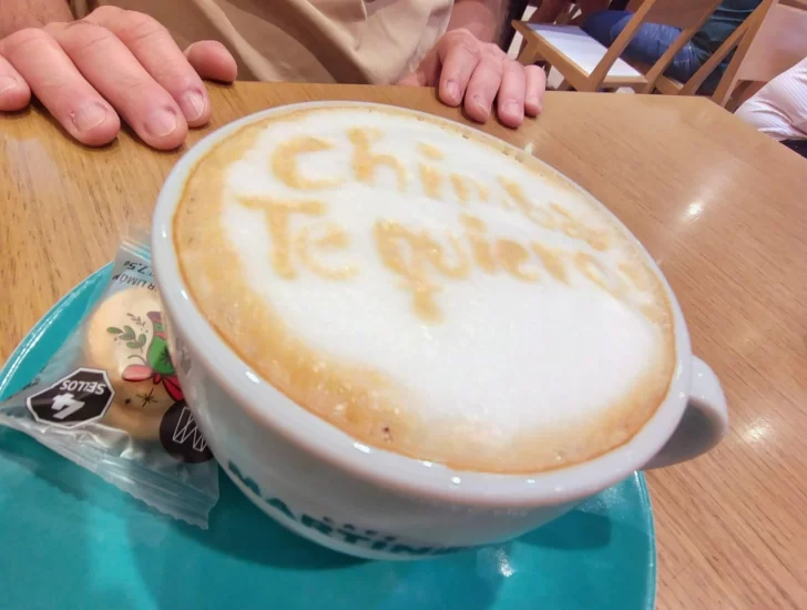 Este jueves, el exintendente estuvo en el negocio gastronómico ubicado por calle Entre Ríos antes de Rivadavia. Fiel a la costumbre, pidió un café con leche con medialunas. No esperó que las mozas hicieron un café especial: el Chimbas Te Quiero, con artelatte.