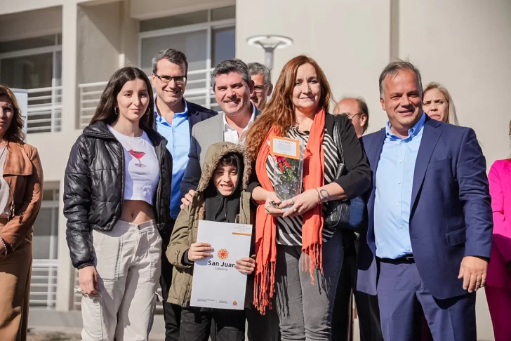 Este lunes, el gobernador Marcelo Orrego entregó las llaves de su vivienda propia a 72 familias. Fue en el Complejo Jacarandá del CGI del Personal del Banco San Juan, ubicado en el departamento Rawson.