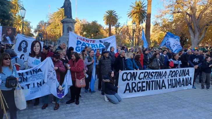 Alrededor de 300 personas se concentraron este miércoles por la tarde en la Plaza 25 de Mayo para manifestar su apoyo a Cristina Fernández de Kirchner, en una réplica local de la masiva movilización nacional que tuvo como epicentro la Plaza de Mayo en Buenos Aires. La convocatoria sanjuanina fue impulsada por sectores del Frente Patria Grande, la Escuela Néstor Kirchner, juntas departamentales, la Asamblea Permanente por los Derechos Humanos y Generación de Todos, entre otros. También dijo presente el exgobernador y referente del PJ local, José Luis Gioja.