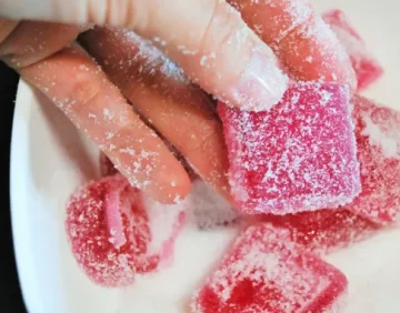 - Llegados a este punto ya podrás comer tus gomitas, pero si quieres también puedes cubrirlas con azúcar fina. Para ello, coloca suficiente azúcar en un bol y ve depositando los caramelos hasta que se impregnen por completo.