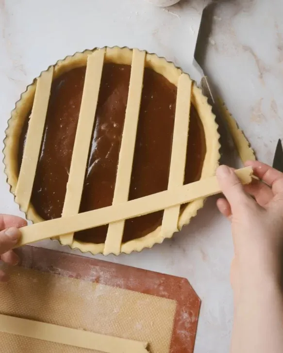 - Con el 1/3 de masa restante, estirarla y cortar tiras finas (1 cm de ancho). Colocarlas sobre el relleno formando el clásico enrejado de pastafrola.