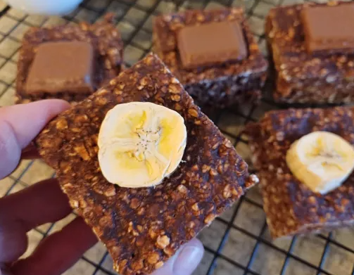 - Una vez frío, retira el papel de horno y corta en cuadritos para servir. Ya está listo nuestro brownie con plátano con avena