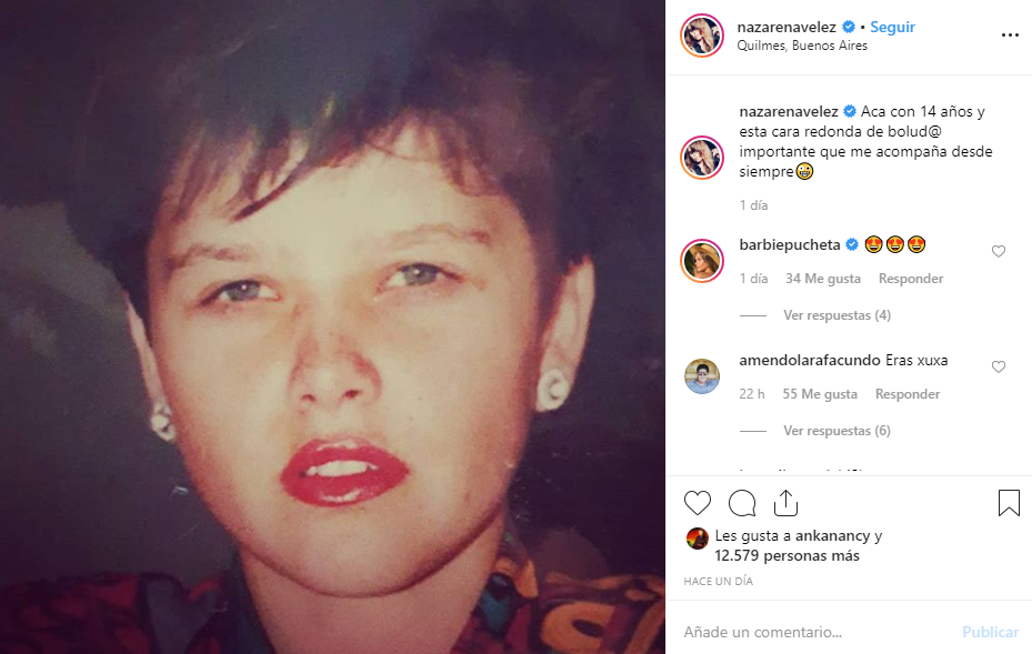 “Acá con 14 años y esta cara redonda de bolud@ importante que me acompaña desde siempre”, escribió Nazarena Vélez en la red social.