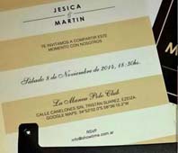 "Jésica & Martín. Te invitamos a compartir este momento con nosotros. Sábado 8 de noviembre de 2014, 18.30 hs. La Marea Polo Club", dice la tarjeta principal. Pero en el sobre también hay una pulsera, estilo vip, con los nombres de los novios para controlar la "exclusividad".