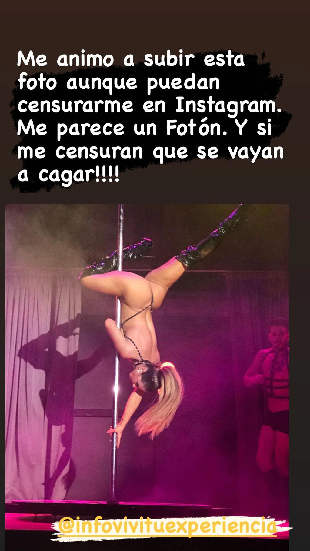 Adabel Guerrero compartió una foto subida al caño, mientras realizaba un baile en su obra “Sex”, y desafió la censura de Instagram. “Es un fotón, que se vayan a c… si me censuran”, escribió en sus stories.