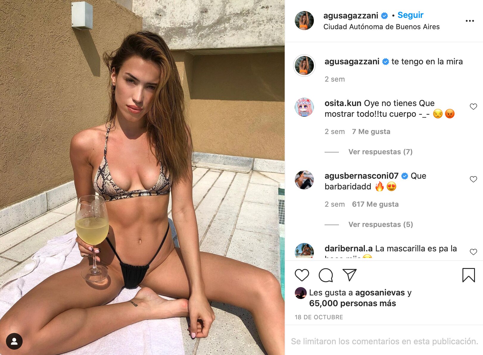 Entre los comentarios, y como siempre, hizo asomo su novio Agustín Bernasconi, que le escribió “A la mierrrr ��������”. Desde que volvieron, la pareja se muestra fan uno del otro y siempre publican videos y fotos del amor que se tienen. Él comenzó su carrera con Aliados, pero hoy le pone toda la ficha a su carrera en el mundo de la música. El video de su grupo MYA, que integra junto a Maxi Espindola, que presenta la “2:50” ya tiene más de 6 millones de reproducciones.