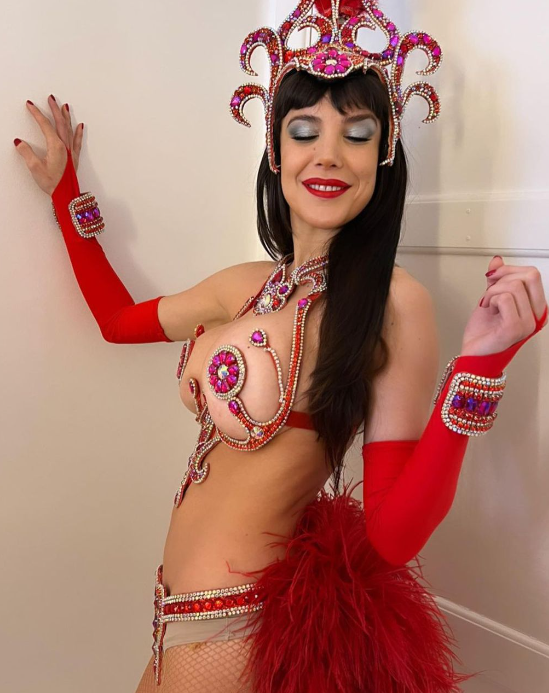 Rincón ya había adelantado a través de sus historias el traje de pezoneras, conchero, casquete y plumas en los tonos rojos y plateados, que resaltan sus curvas. Ahora las compartió en su perfil y enloqueció a sus seguidores con el jugado look.