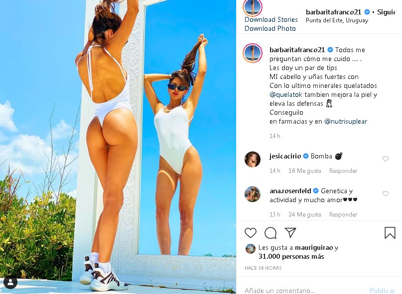 La modelo subió a Instagram una foto donde se la ve con una malla enteriza blanca donde se resalta su tonificado cuerpo y principalmente sus curvas traseras que despertaron pasiones de sobre todo de sus seguidores masculinos. El posteo que fue publicado hace tan sólo unas horas despertó la reacción de sus fans ya que la misma cosechó más de 30 mil likes y cientos de comentarios elogiando a la hermosa morocha.