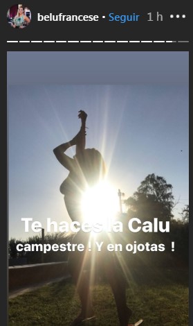 Si bien en el posteo se deja ver ese texto, en las historias de la misma red social, Belén escribió: “¡Te hacés la Calu campestre y en ojotas!”.
