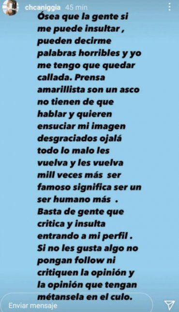 Y finalizó: “Ser famoso significa ser un ser humano más. Basta de gente que critica e insulta entrando a mi perfil. Si no les gusta algo no pongan follow, ni critiquen la opinión… La opinión métansela en el c…”.