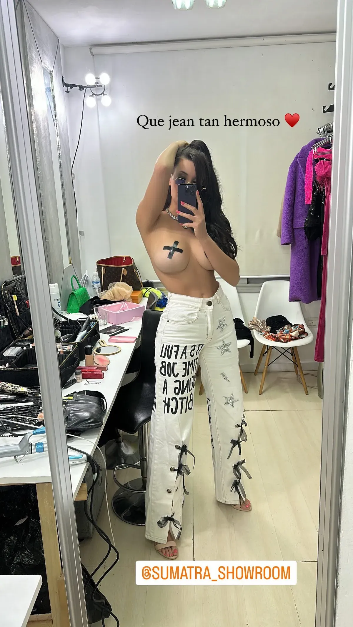 Es que de lo más sexy, Charlotte se fotografió sin remera ni brassier tapando sus lolas con cintas negras en forma de cruz.