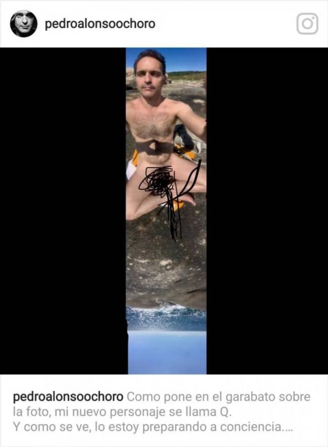 Junto a la imagen, en la que cubrió sus partes íntimas, escribió: "Como pone en el garabato sobre la foto, mi nuevo personaje se llama Q. Y como se ve, lo estoy preparando a conciencia".