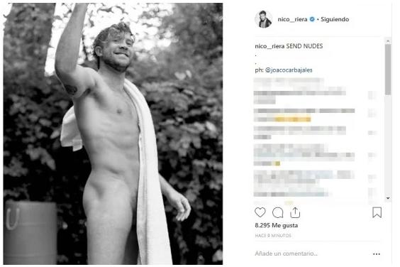 Se trata de Nicolás "Tacho" Riera (33), quien encendió Instagram con una foto en blanco en negro donde se lo ve posando desnudo y tapándose tan sólo con una toalla: "Send Nudes", tituló la publicación que estalló con comentarios de sus fans y miles de corazoncitos.