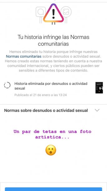 “Hemos eliminad tu historia porque infringe nuestras normas comunitarias sobre desnudos o actividad sexual. Hemos creado estas normas teniendo en cuenta a nuestra comunidad internacional, y ciertos público pueden ser sensibles a diferentes tipos de contenido", le comunicaron desde Instagram.