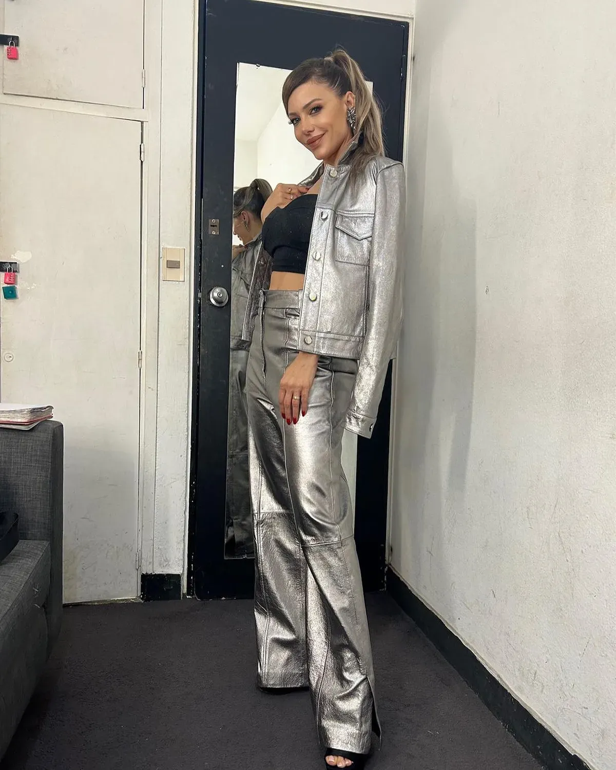 Desde su camarín, Evangelina Anderson dejó a la vista todos los detalles de su elección estilística que hasta se animó a llevar sin ropa interior, presumiendo los recortes a nivel extremo.