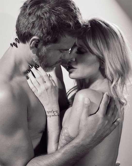 El matrimonio posó en una sesión de fotos muy audaz. En blanco negro, con el torso desnudo, la pareja se funde en un abrazo y en un beso apasionado.