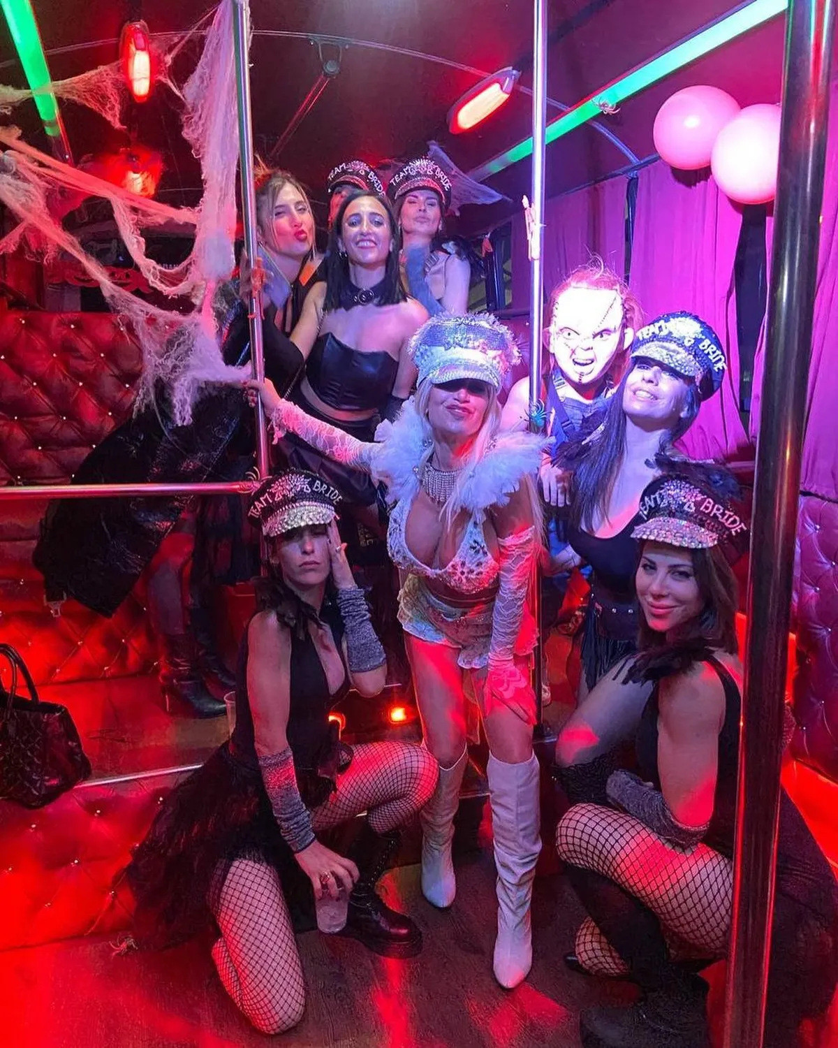 Fiel a su estilo, Florencia Peña no solo se disfrazó de una novia súper hot sino que además festejó con sus amigas en un party bus, se animaron al toro mecánico y hasta bailaron en el caño.
