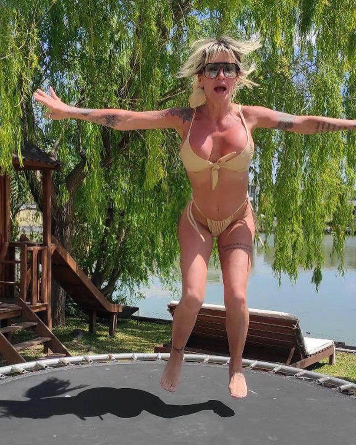 Siempre atrevida, Florencia Peña no dudó en saltar sobre la cama elástica de su hijo Felipe y presumió su figura en una micro-bikini dorada que le quedaba a la perfección.