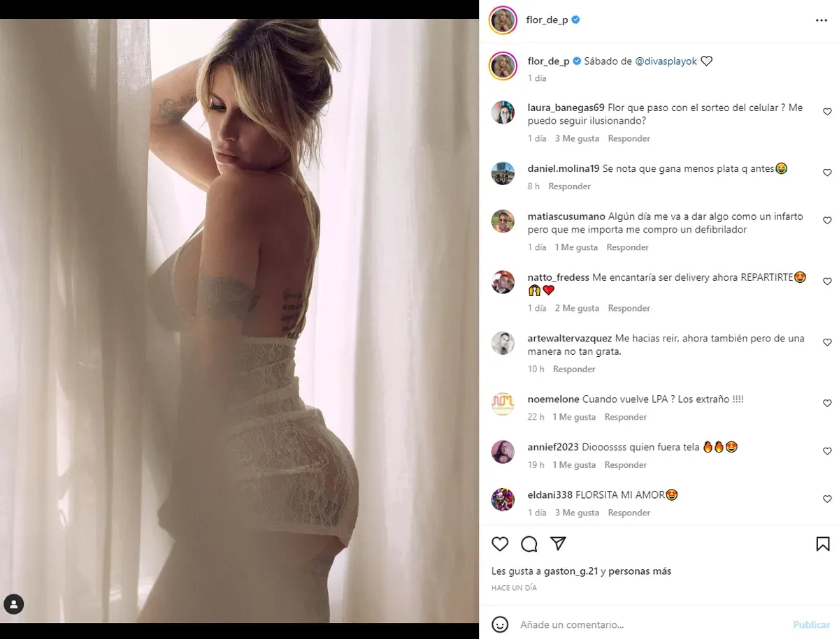 "Sábado de Divas Play", escribió Flor en su último posteo. En la foto se la puede ver con un babydoll de encaje blanco apoyada en una ventana.