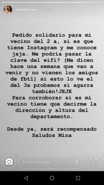 "Pedido solidario para mi vecino del 2a, si es que tiene Instagram y me conoce jaja. Me podría pasar la clave de Wifi?", escribió Bonino en una de sus stories.