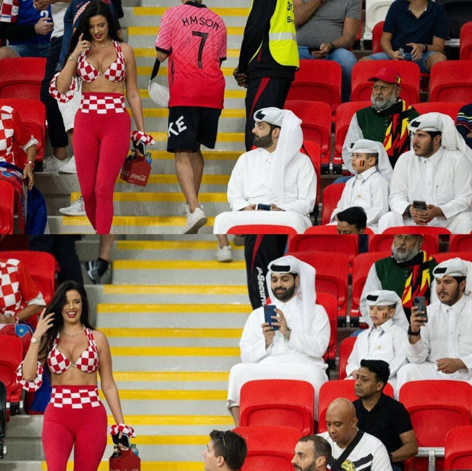 Por ejemplo, la modelo apareció con un vestido largo que se ajustaba a la figura en el empate 0-0 de Croacia con Marruecos, luego decidió usar un atuendo más revelador para su victoria por 4-1 sobre Canadá. Vestimentas que, según lo dicho por los qataríes, están prohibidas para las mujeres.