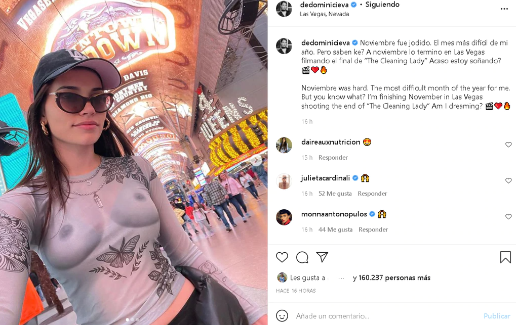 “Noviembre fue jodido. El mes más difícil de mi año. ¿Pero saben ke? A noviembre lo termino en Las Vegas filmando el final de The Cleaning Lady. ¿Acaso estoy soñando?”, escribió la actriz, contenta por su presente laboral.