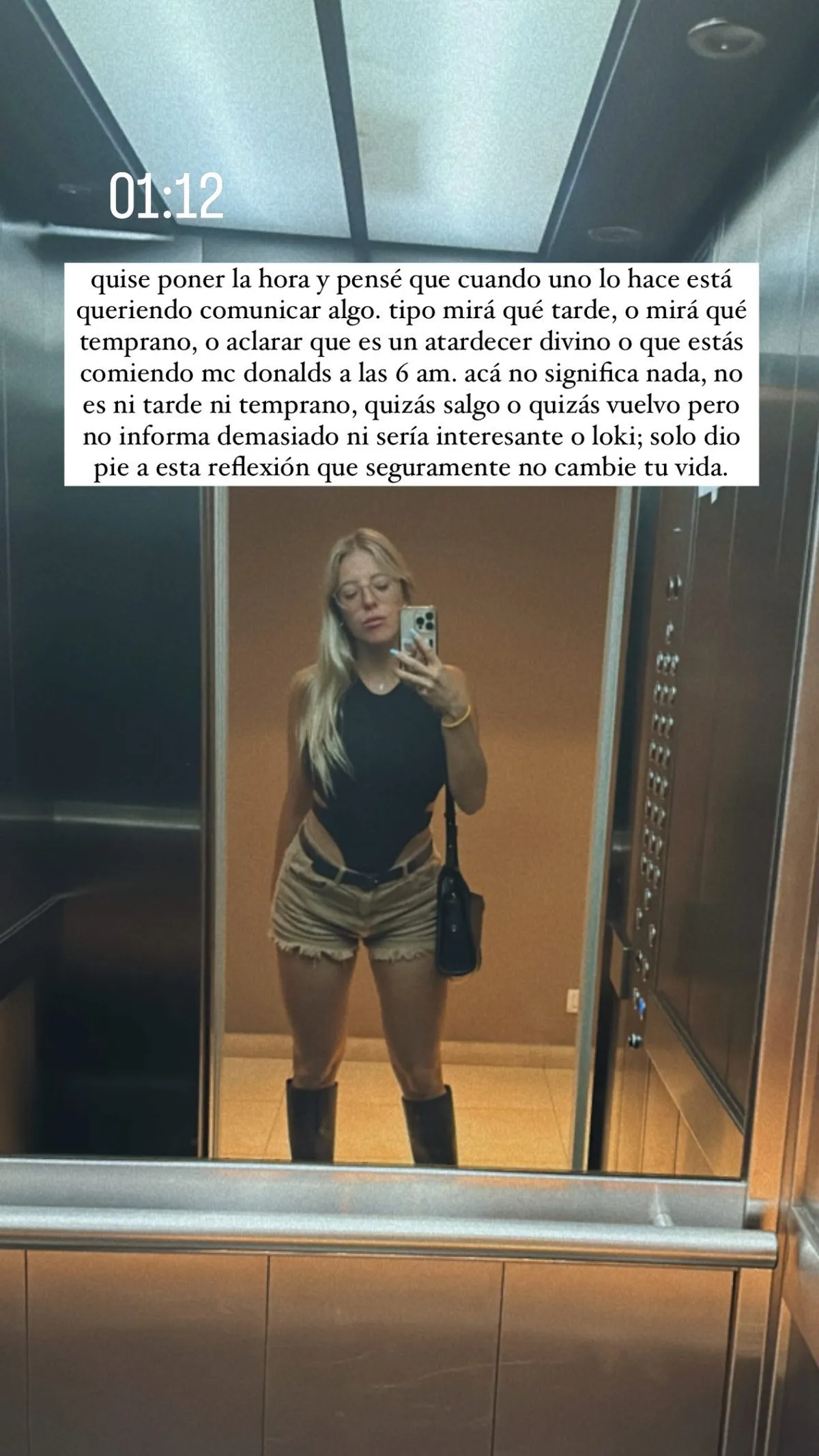 "Quise poner la hora para comunicar algo. No es ni tarde ni temprano, quizás salgo quizás vuelvo pero no informa demasiado ni sería interesante, solo dio pie a este reflexión que seguramente no cambie tu vida", escribió junto a la storie haciendo una reflexión aunque lo cierto es que fue su atuendo el que se robó toda la atención.