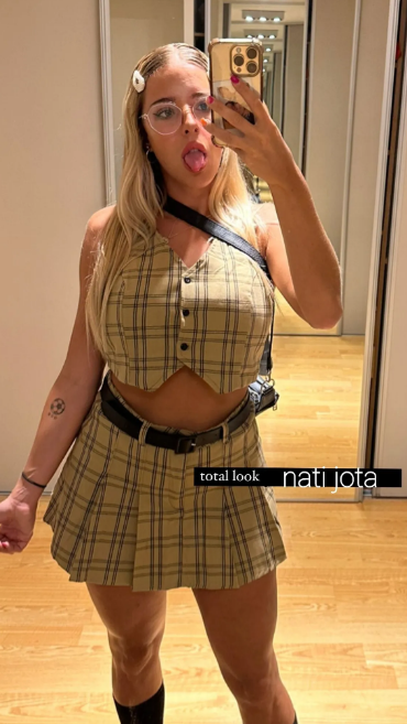 Una vez más, Nati Jota apostó por la tendencia preppy colegiala con una mini escoseca y chaleco al tono llevándola a otro nivel y causando todo un terremoto entre sus fans.