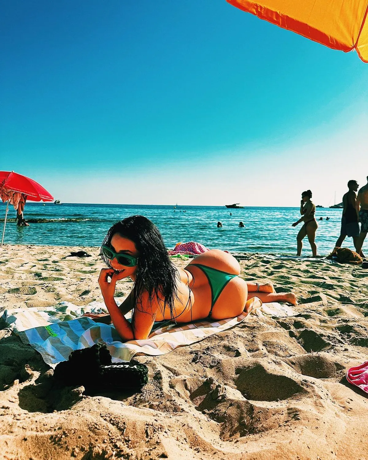 Desde las playas de Ibiza, la diosa disfrutó del sol eligiendo un modelo de bombacha colaless en diferentes tonos de verde y lo modeló posando de espaldas.