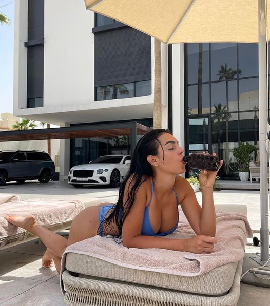 También se la puede ver a Georgina Rodríguez recostada en una reposera, tomando una bebida y dejando ver tanto su parte de adelante como la de atrás. Una imagen que prendió fuego su Instagram y con la que demuestra que está más contenta que nunca con su espectacular físico.