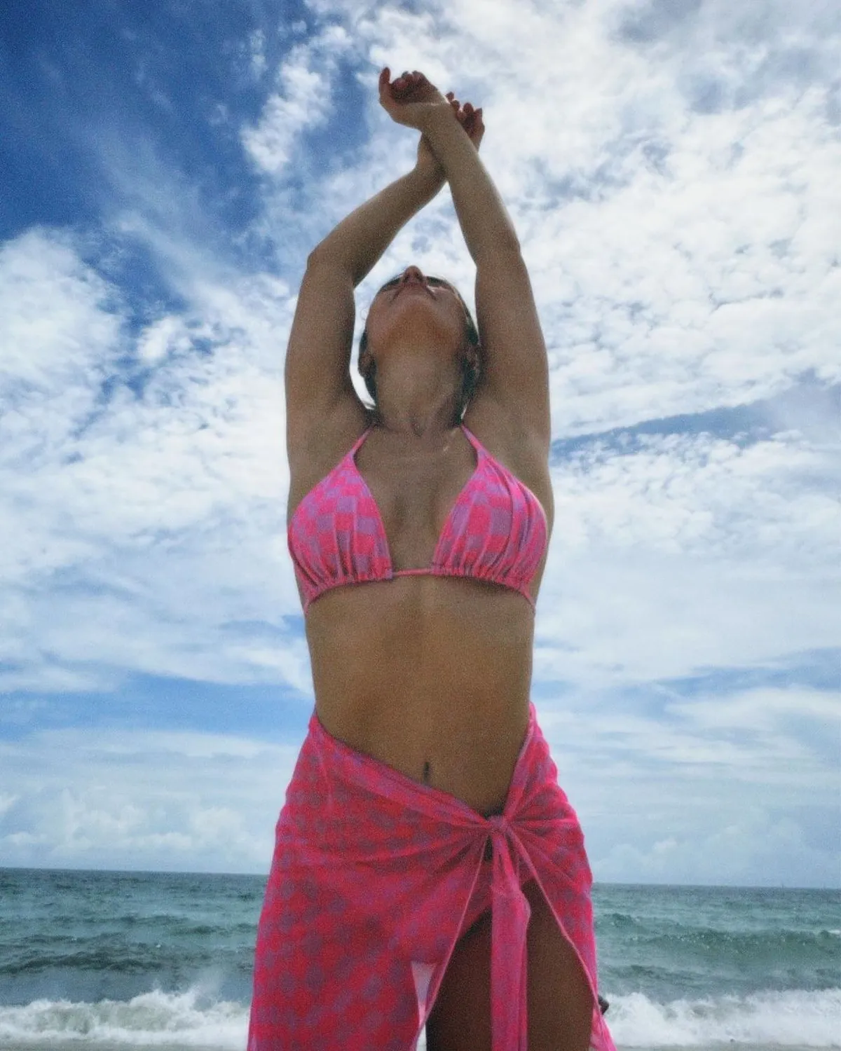 Primero se la jugó con una micro-bikini luxury bicolor Barbiecore en diferentes tonos de rosa y la llevó con mini pareito anudado, la fórmula que uso María Becerra en Europa.