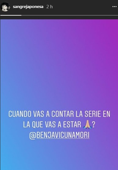 “¿Cuándo vas a contar la serie en la que vas a estar, Benjamín?”, publicó la China “apurando” a Vicuña en sus historias de Instagram, donde incluso lo mencionó para que su comentario no pase desapercibido.