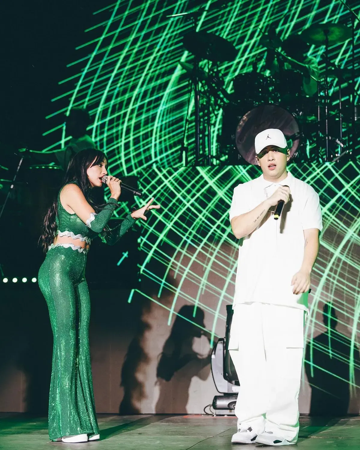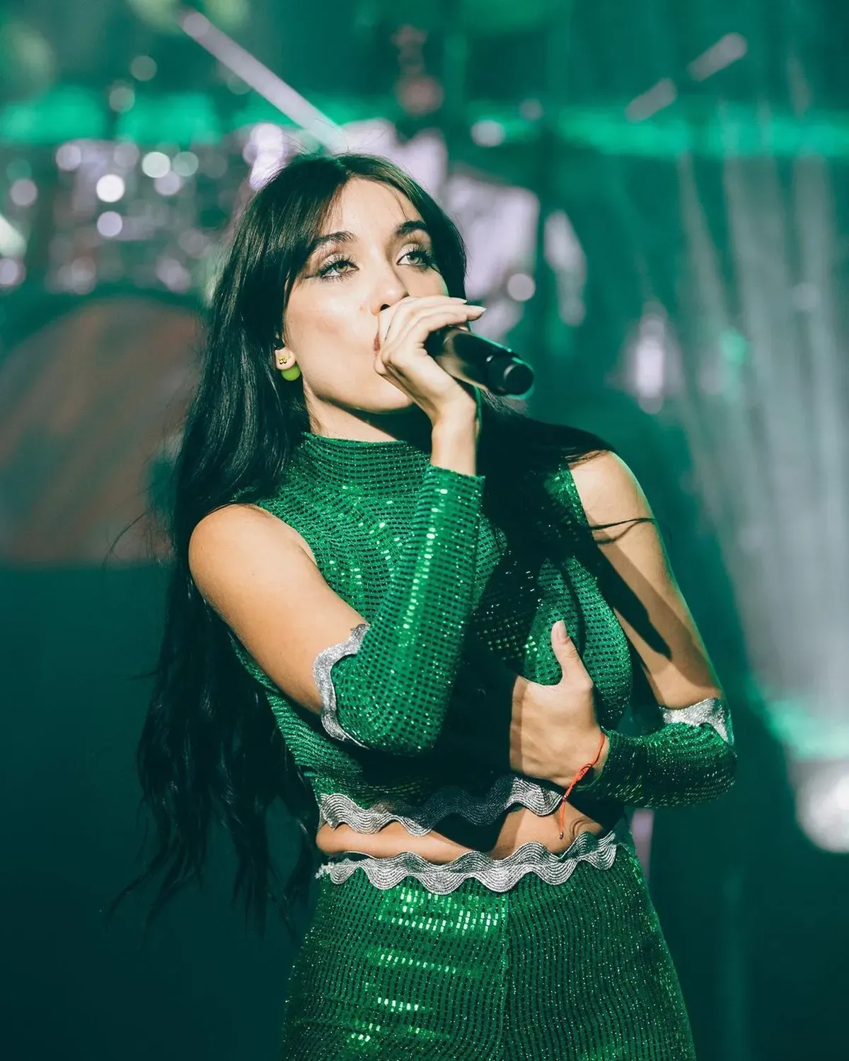 La diosa se subió al escenario acompañada por FMK y apostó por un conjunto monocromático color verde al mejor estilo Selena.