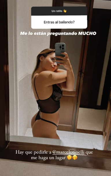 Esta vez usó sus historias para interactuar con sus seguidores con la “caja de preguntas”. Posó frente al espejo con un top negro de encaje y transparencias que deja ver sus curvas. Y aprovechó para tratar de llamar la atención de Marcelo Tinelli.