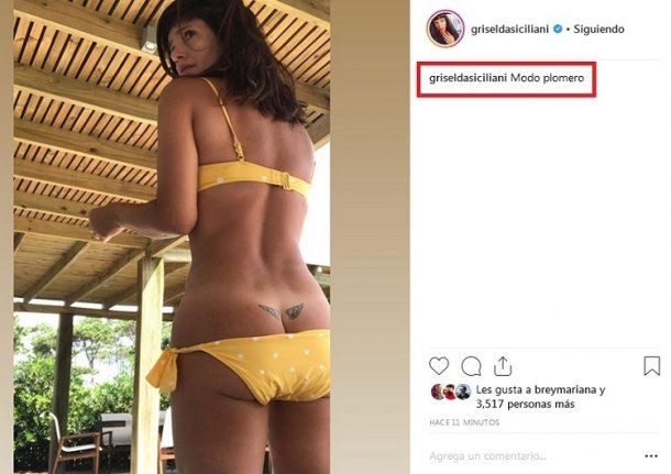 La particularidad es que la parte inferior de la bikini está corrida hacia abajo, lo que deja más a la vista la parte superior de su cola. Por este motivo, acompañó a la foto con un irónico mensaje: “Modo plomero”.