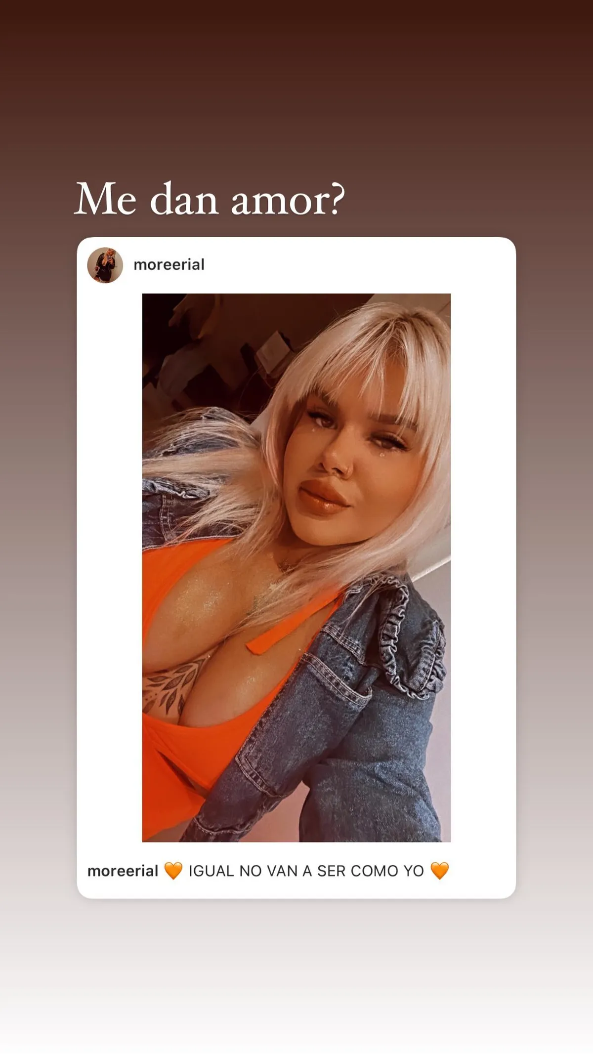 Como si fuese poco, la hija de Jorge Rial acompañó su publicación con un tremendo mensaje en sus historias. "¿Me das amor?", escribió en su reposteó mientras que un su feed agregó "Igual no van a ser como yo".
