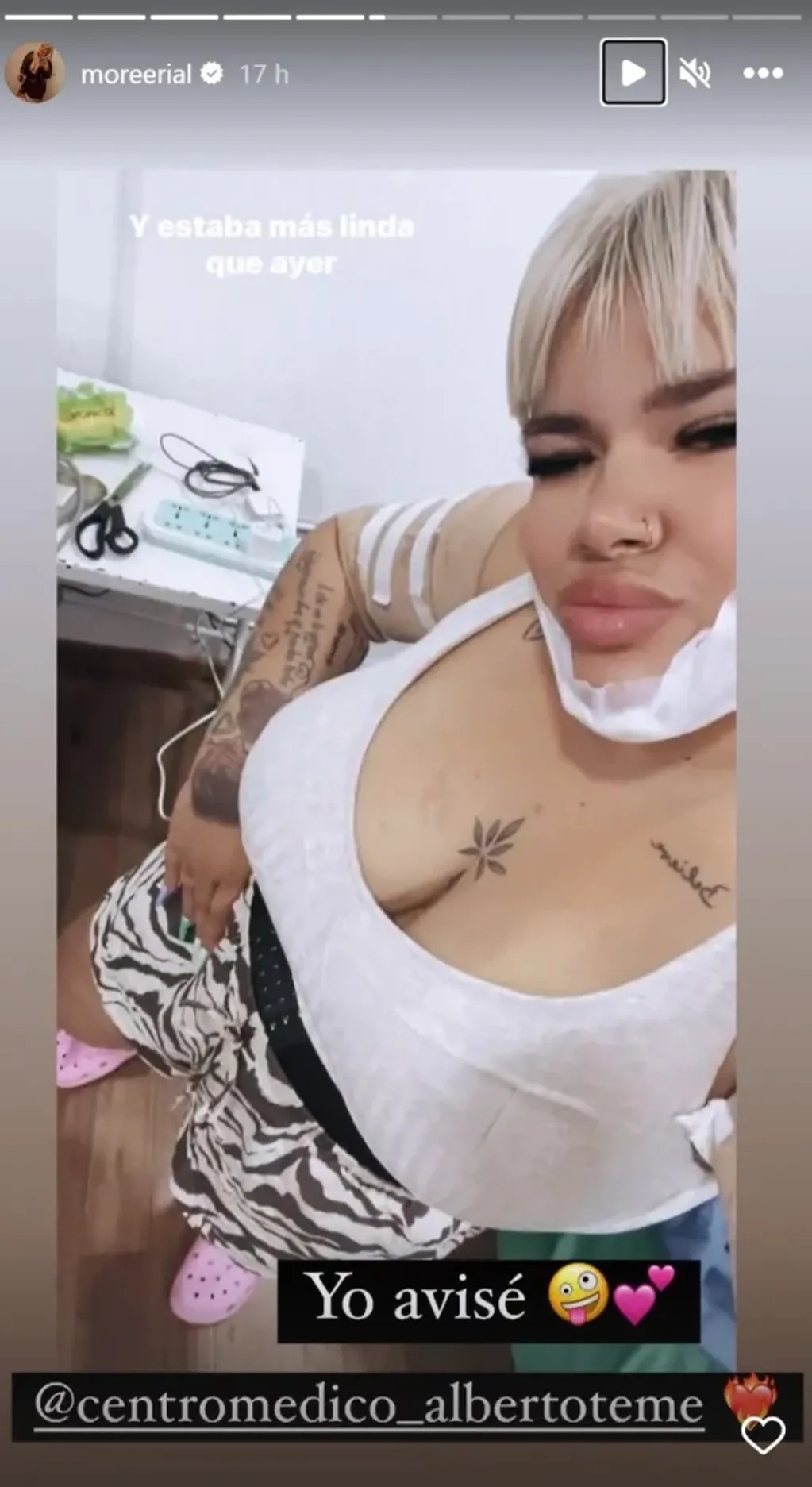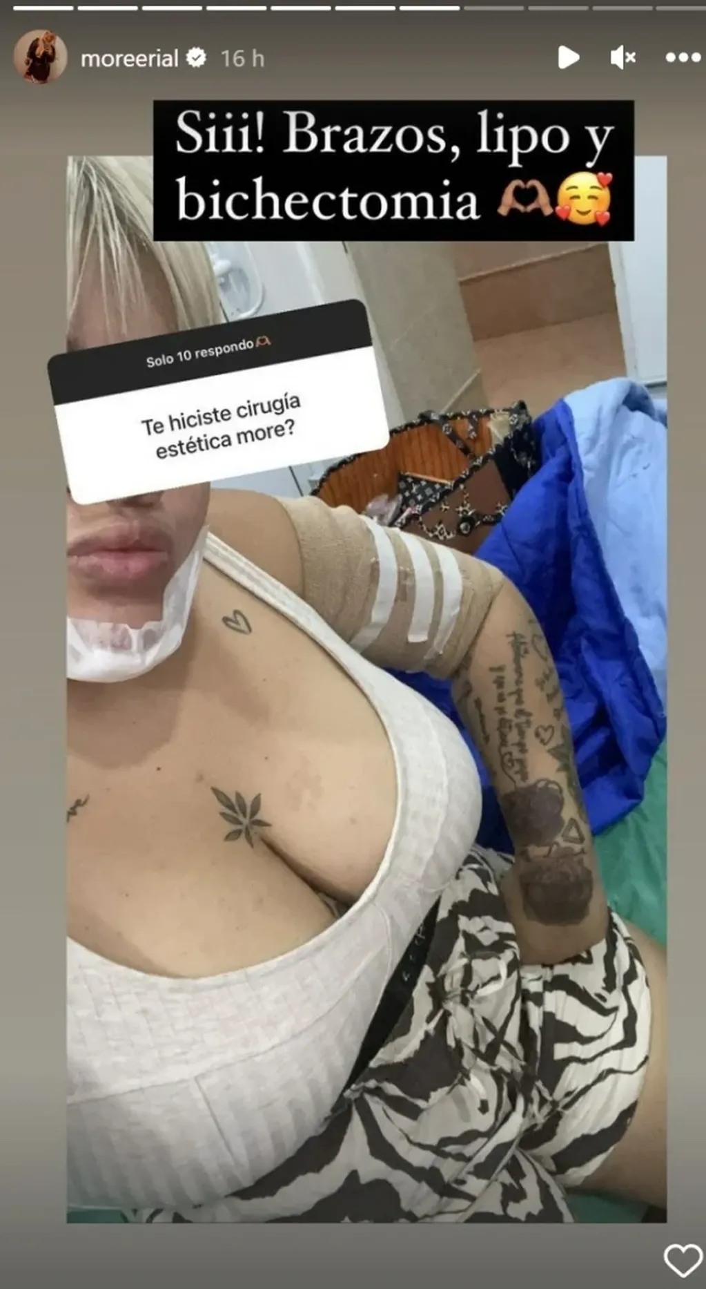 En sus historias de Instagram, More Rial siguió dando informaciones ante las reiteradas preguntas de sus seguidores. Contenta, la joven se sacó una foto con vendas en diferentes partes del cuerpo y reveló qué retoques estéticos se hizo en los brazos, abdomen y el rostro.