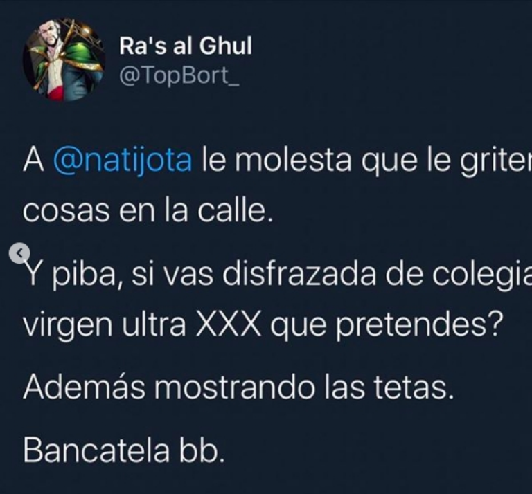 Ahora, un usuario de Twitter la cuestionó que se quejara de los comentarios que recibe en la calle y cuestionó la forma de vestirse de la periodista. "A Nati Jota le molesta que le griten cosas por la calle. Y piba, si vas disfrazada de colegiala virgen ultra XXX, ¿qué pretendés? Bancatela, bebé".