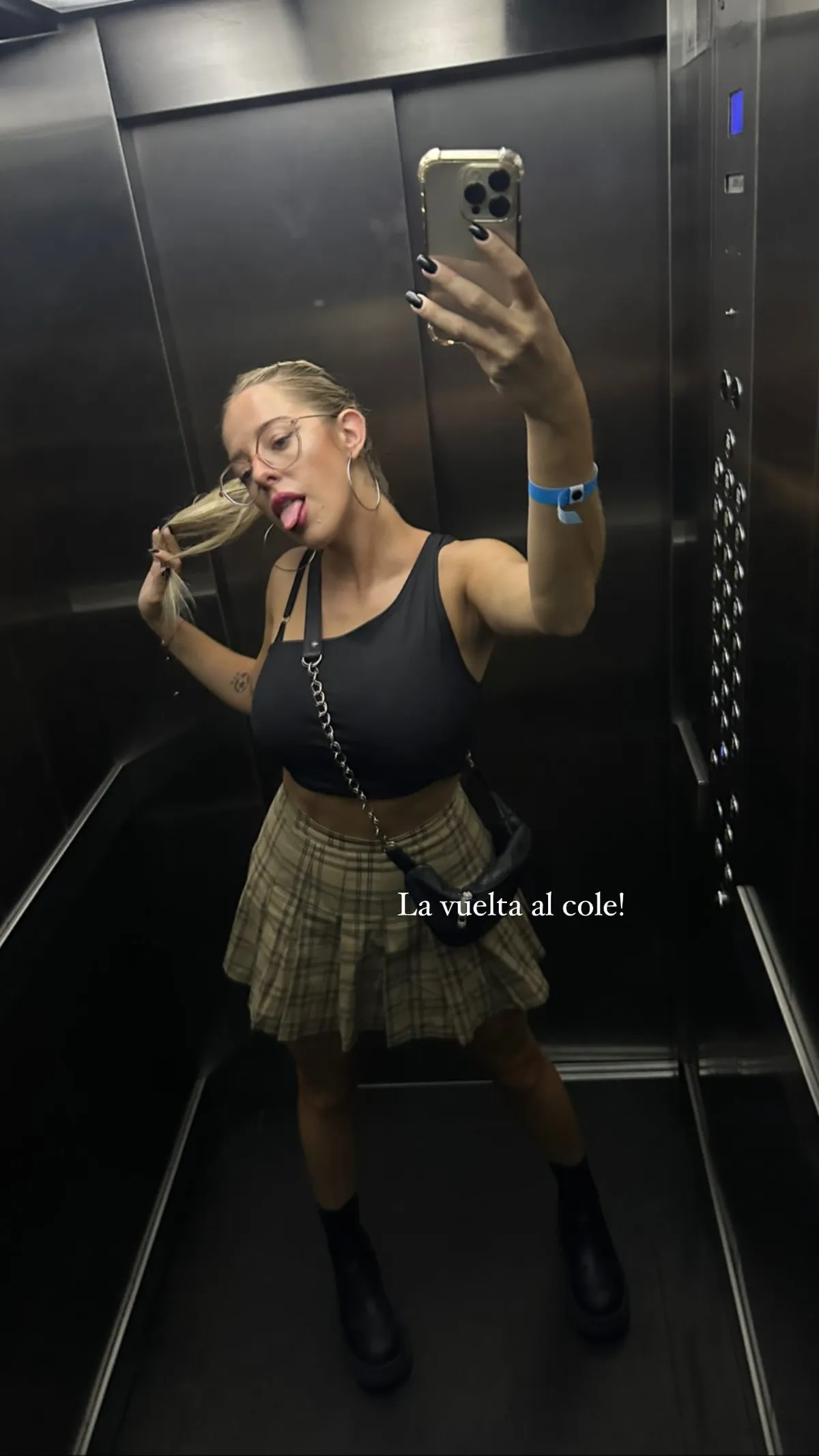 En uno de ellos, la panelista decidió usar un look colegiala y se inmortalizó a bordo de un ascensor. "La vuelta al cole", fue el mensaje de Nati Jota, al vestirse con un top negro, una falda escocesa y zapatos negros.