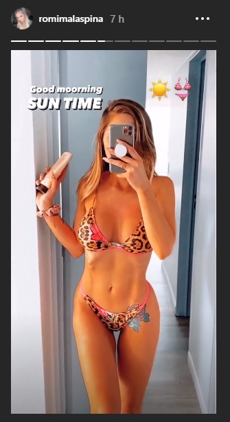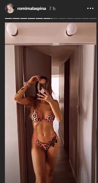 A través de una historia en Instagram la ex Gran Hermano se mostró con un filtro en donde se cuerpo se veía muy bronceado junto a dos emojis de una bikini y un sol. Luego y para aclarar a todos que su piel no luce así, Romina se mostró al natural y aseguró que le falta un buen bronceado en su piel.