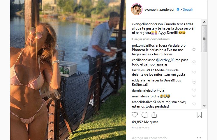 “Cuando tenés atrás al que te gusta y te hacés la diosa, pero él ni te registra. Ay, Demi”, escribió Eva con mucho humor en la imagen que compartió en la red social, la cual generó comentarios positivos entre sus fans, quienes rieron junto a la rubia por sus ocurrencias al momento de contextualizar la imagen. La foto superó los 60 mil “me gusta” en solo seis horas.