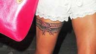 Estados Unidos, 27 de marzo.- Luego de varios retoques, la modelo inglesa Katie Price se terminó el dibujo en su pierna derecha que simula una liga.