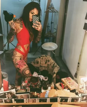Con un body rojo de corte asimétrico y otro blanco con transparencias, la artista plástica lució su figura y también se permitió burlarse de sí misma al compararse con una estatuilla del Martín Fierro ya que para otro de los looks le hicieron un body painting dorado.