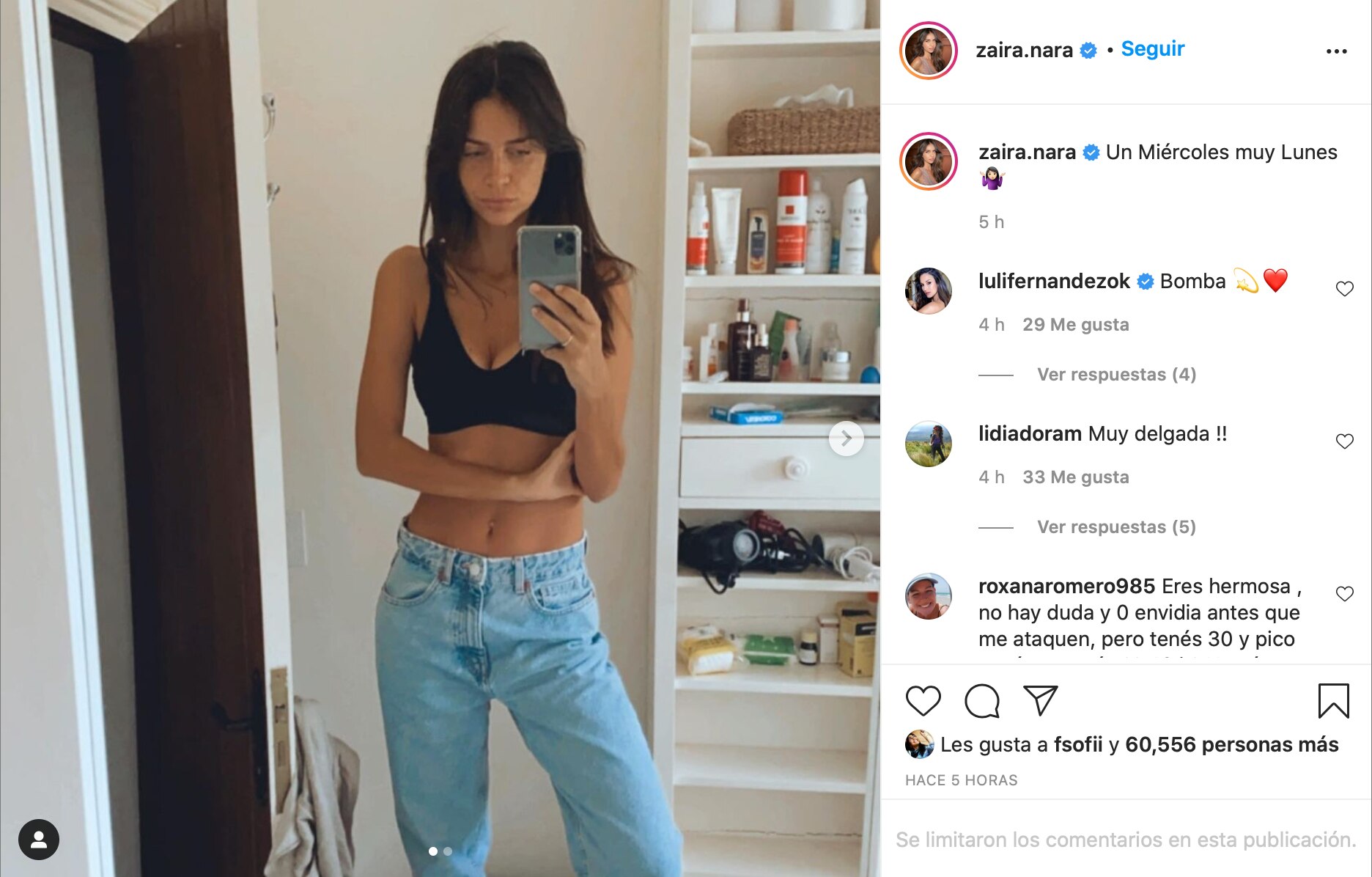 Una usuaria escribió un comentario que generó un hilo de al menos 10 respuestas: “Eres hermosa, no hay duda y 0 envidia antes que me ataquen, pero tenés 30 y pico… cuánto pesás?? 40 k? No sé, pero… no es muy poco? No dá para ejemplo a las chicas y no digan que es su contextura, porque no es así, no era así antes…”. Entre las respuestas hubo algunas que apoyaron esta postura, pero muchas otras que no creían correcto opinar sobre el cuerpo de Zaira. Una usuaria incluso explicó que seguro se debía a que la modelo aún da pecho, y muchas veces eso puede generar una importante baja de peso.