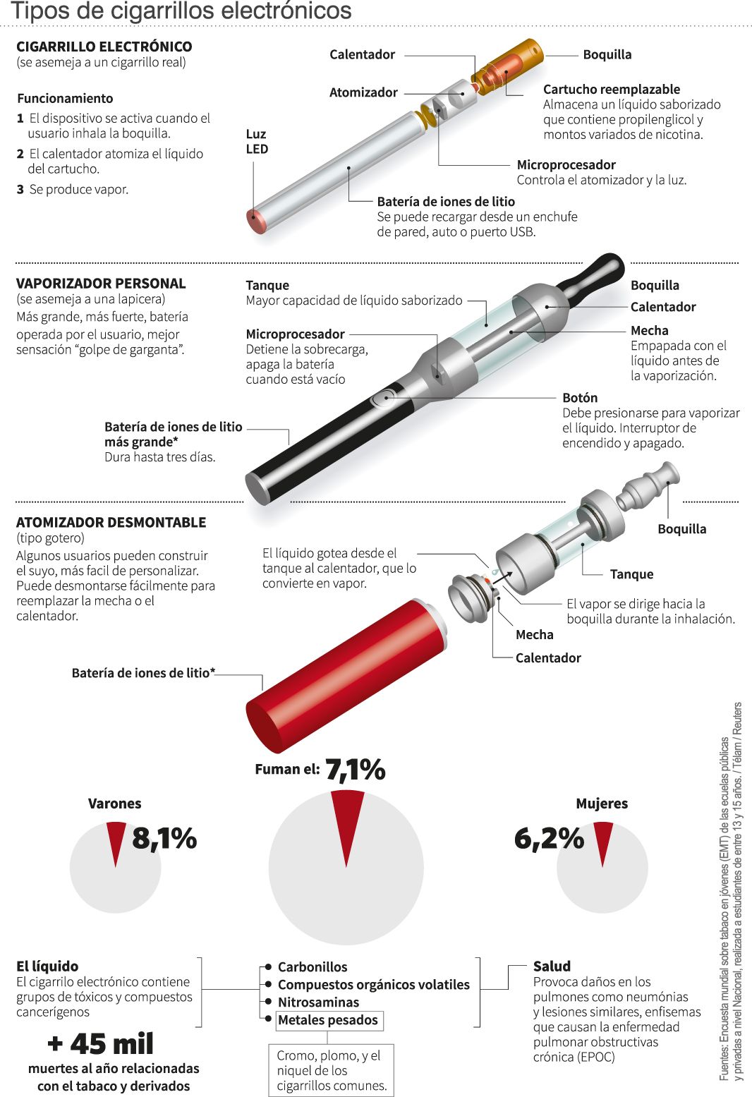 "Varios estudios revelan que el aerosol que emanan los cigarrillos electrónicos contiene cuatro grupos de tóxicos y compuestos cancerígenos, llamados carbonilos, compuestos orgánicos volátiles, nitrosaminas y metales pesados", detallaron desde la Secretaría de Salud. Asimismo, se encontró que poseen "más cromo, plomo y níquel que los cigarrillos comunes".